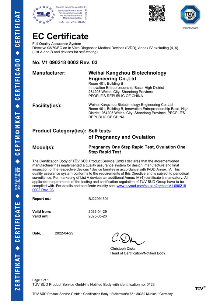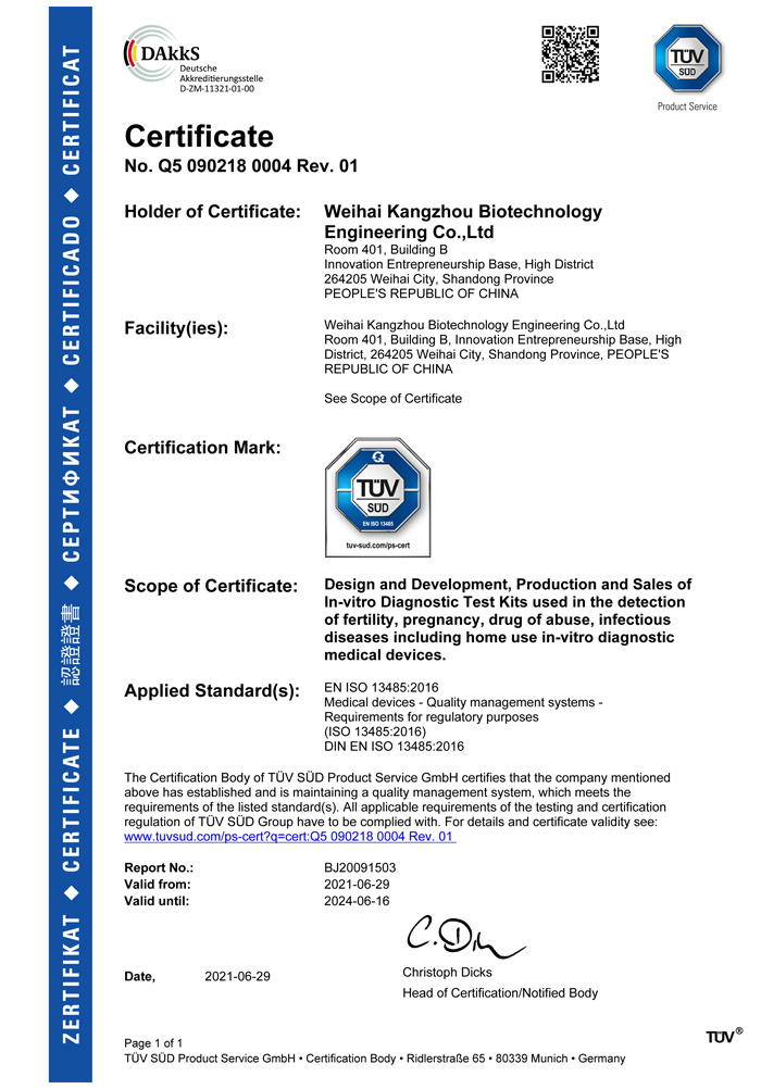 ? ? ?威海康州生物工程有限公司成立于2013年,公司坐落于風(fēng)景秀麗的海濱小城——威海市。康州生物是集研發(fā)、生產(chǎn)和銷售于一體的生物科技公司,與威海哈爾濱工業(yè)大學(xué)合作研發(fā)團(tuán)隊(duì),擁有先進(jìn)的科研基地及生產(chǎn)基地。主要從事快速診斷檢測產(chǎn)品的研發(fā)、生產(chǎn)、銷售。產(chǎn)品涵蓋:生育檢測、藥物濫用檢測、農(nóng)藥殘留檢測以及其他臨床診斷檢測等。公司自主研發(fā)生產(chǎn)得早早孕試紙,排卵檢測試紙,毒品檢測及疾病檢測等醫(yī)用產(chǎn)品,經(jīng)過歐盟認(rèn)證,產(chǎn)品質(zhì)量穩(wěn)定,值得信賴。